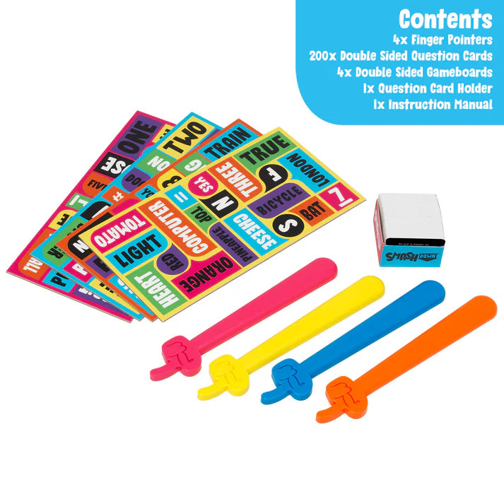 - WHO HAS THE FASTEST FINGER?: A modern twist on the family trivia game without long, boring rules! The question master reads out a question card and the players must race to smash the answer on the gameboards using their finger pointer and shout "Smash Down