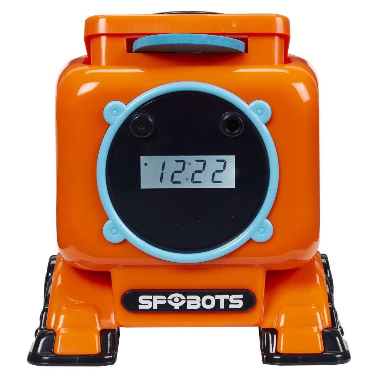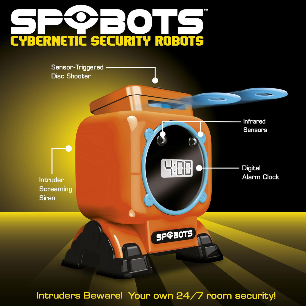 ClockBot – the disc-shooting robot alarm clock. You know you’re safe with this disc-shooting robot alarm clock by your side. ClockBot looks like an ordinary digital alarm clock, but when you switch it to “Guard” mode, this next-level SpyBot goes on full alert. Once its invisible motion-sensor beam is tripped ClockBot will blast a screeching alarm and fire foam discs at the “intruder” to scare them away! ClockBot is one of four Spybots Cybernetic Security Robots - T. R. I. P, SpotBot, Room Guardian and ClockBot.