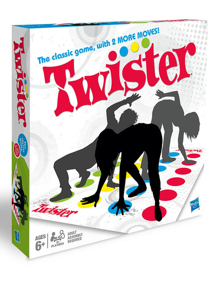 Add a twist of fun into any party or family night with the game that ties you up in knots! This TWISTER game is the classic game with 2 more moves. Give the spinner a whirl and see what’s next as you try to keep your hands and feet on the mat! Right foot red! Can you do it? Left foot green& you got it! If your knee or elbow touches the mat, or you fall over, you-re out. Be the last player standing to win!