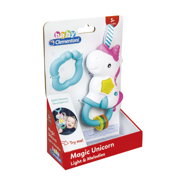 Introducing the Baby Clementoni Magic Unicorn Interactive Rattle. A magical unicorn to entertain the child with light and music! Includes a luminous star-shaped button and coloured pendants to create fun sound effects. The practical ring is designed to attach the rattle to the crib or stroller and take it with you at all times.
