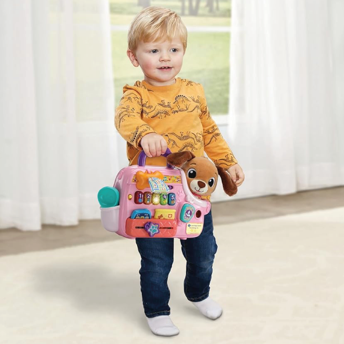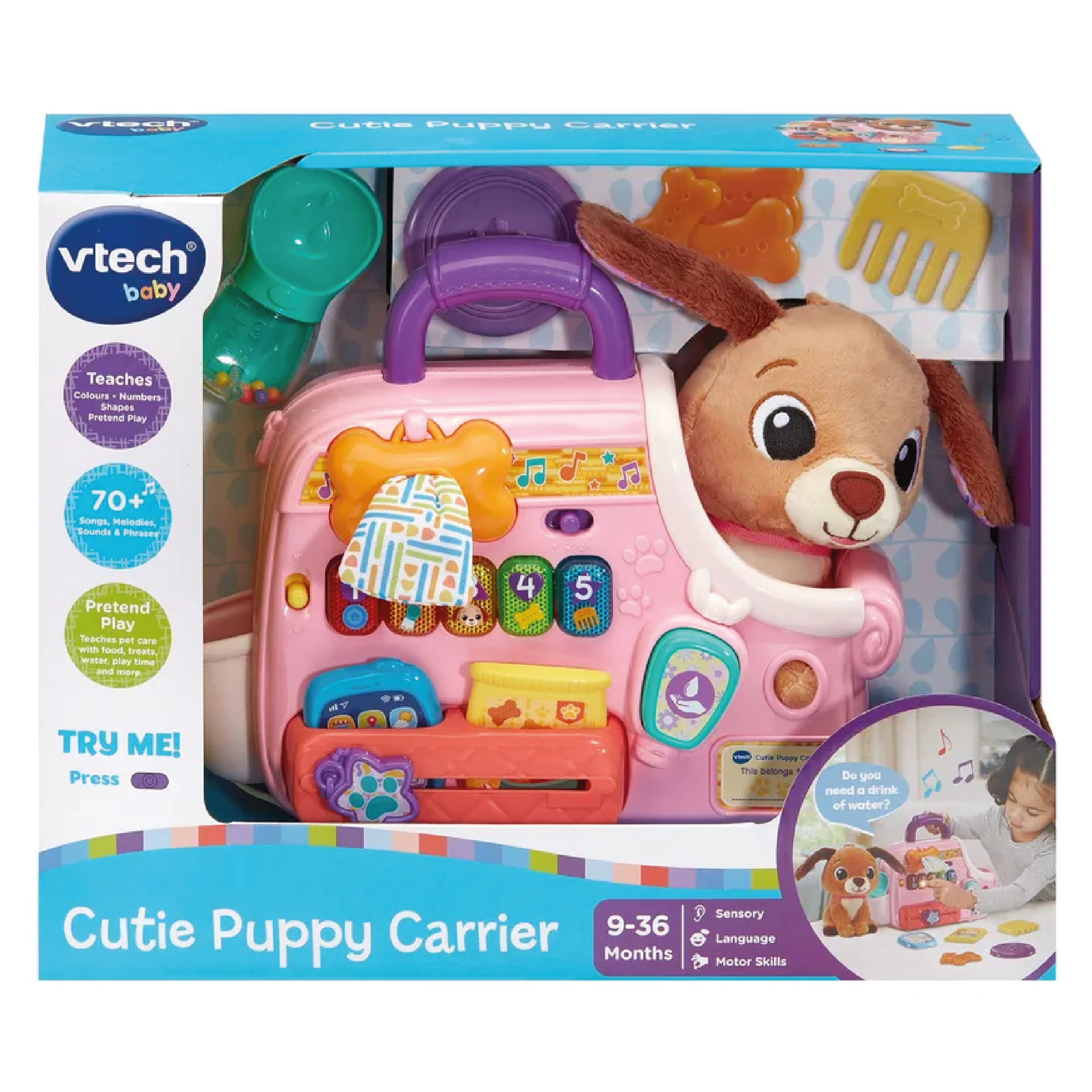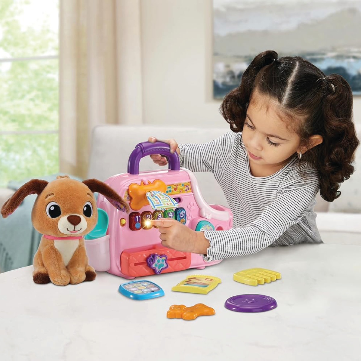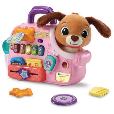- Super cute travel carrier comes complete with adorable soft puppy and everything needed to care for it! Six removable role-play accessories and fun fidget manipulatives all add to the fun! Carrier also features a discovery station that introduces pet care scenarios, numbers, colours and shapes. Features two nurturing songs and 15 fun melodies!