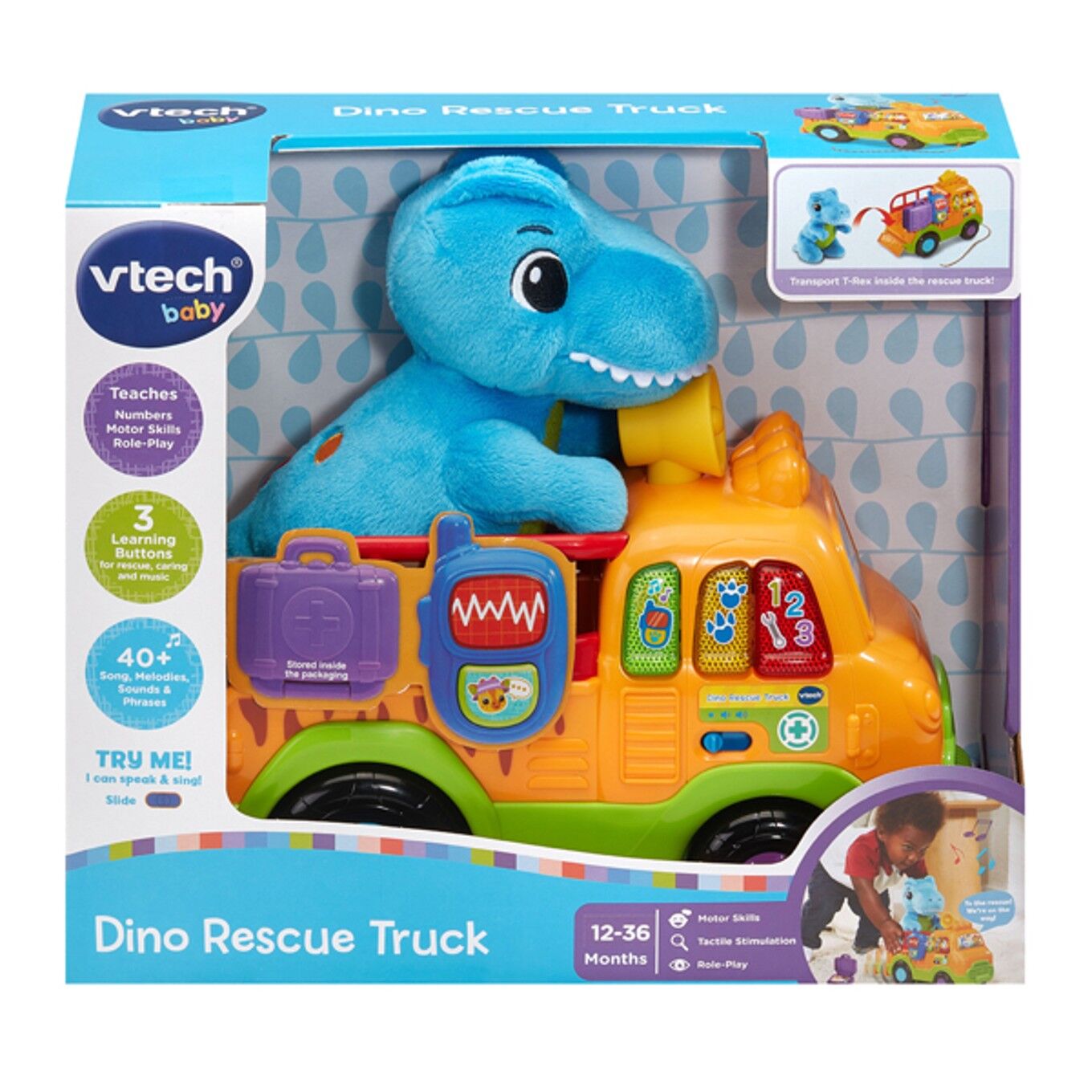 It's time for a rescue and care mission with the Dino Rescue Truck by VTech®! Push or pull the rescue truck along using the attached cord! Then, find the blue soft fabric T-Rex to rescue and care for! 3 light up buttons trigger fun phrases and sounds which encourage children to use their imagination and role-play! Press the pretend walkie-talkie squeaker button to call in the rescue, and open up your medical kit to help care for T-Rex! Open the tailgate and load T-Rex inside ready for a safe transport! Mission accomplished! Enjoy 3 sing-along songs and 15 melodies during play!
