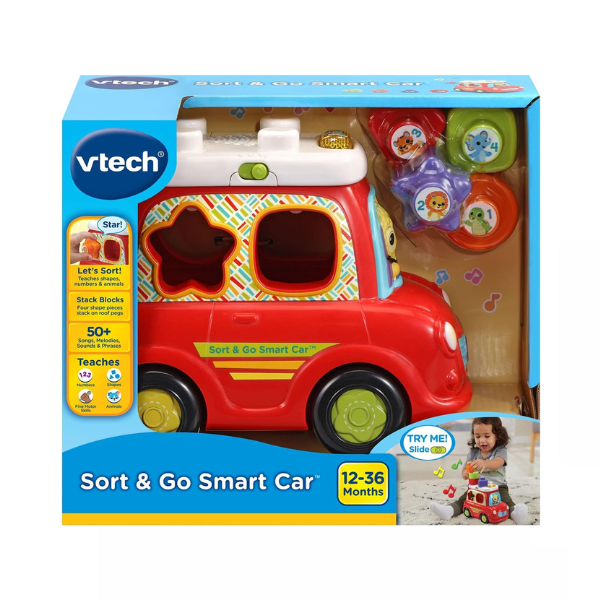 Zoom along and sort the shapes with the Sort & Discover Car by VTech! This fun car features shape sorting pieces that trigger responses when inserted correctly. When your little one places the shapes into the car they will hear the name of the shape, numbers & objects. Open the boot to remove the shapes for continuous play! Press the light up button on the roof to hear fun sing-along songs and melodies. Stack the shapes on the roof to see how high you can get them! Includes 3 lively sing-along songs and 15 melodies.