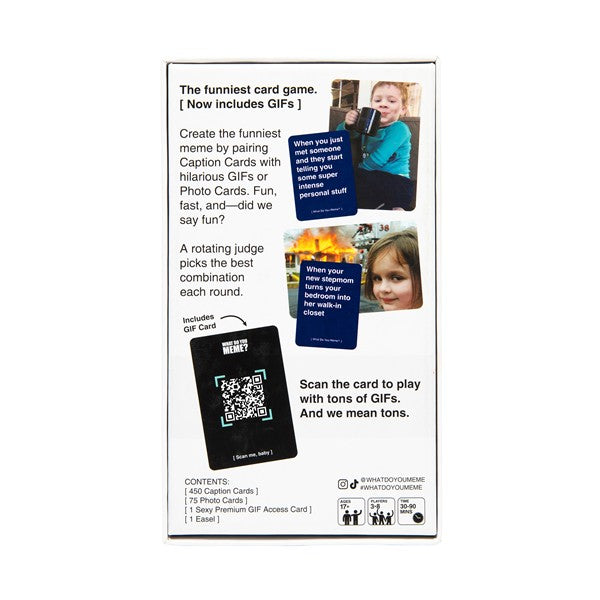 - What’s Inside: Each What Do You Meme core game contains 435 cards. 360 of these are caption cards and 75 are photo cards. Printed on premium playing cards (thick with gloss finish); includes an easel and bonus rules, shrink-wrapped in a custom box.