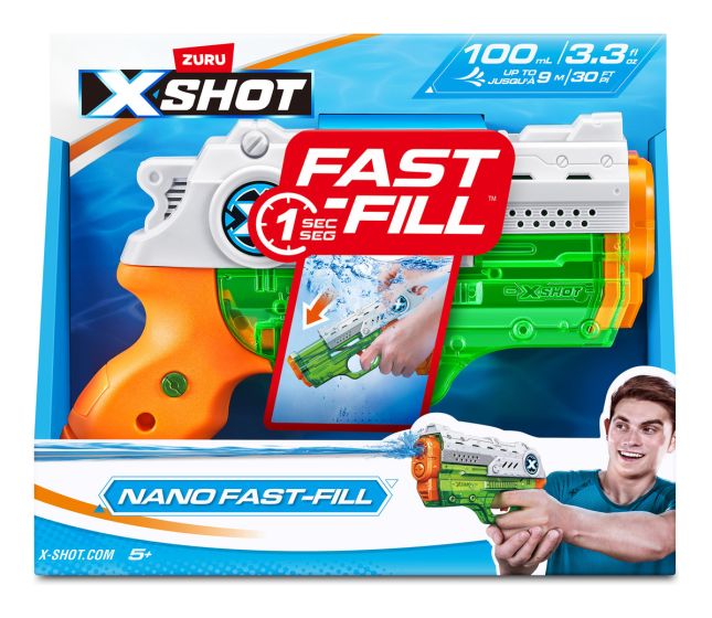 XSHOT Fast-Fill is the fastest filling water blaster ever created. The XSHOT Fast-Fill Nano allows you to refill your blaster in just 1 second and get back to the water blaster action long before your opponents. Just dunk, fill and close with rapid sealing technology. Don’t let the Nano's size fool you! Small but powerful, blast up to 30 feet / 9 meters with its 100mL/3.3 fl. oz. water capacity tank!